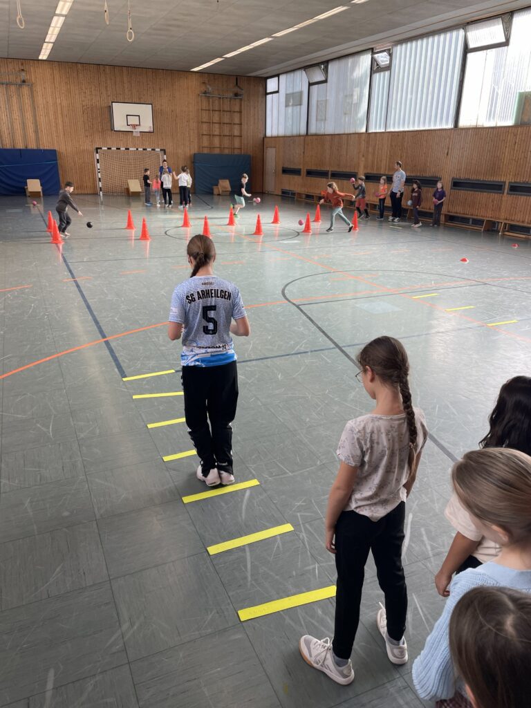 In diesem Jahr durften wir wieder die Handball-Abteilung der SG Arheilgen bei uns an der Schule begrüßen. Unter der Anleitung von Herrn Martin Miedl sowie drei weiteren Trainerinnen konnten sich die Kinder der 3. Klassen an verschiedenen Übungen ausprobieren und somit einen kleinen Einblick in die Sportart Handball erlangen. Die Kinder hatten großen Spaß!